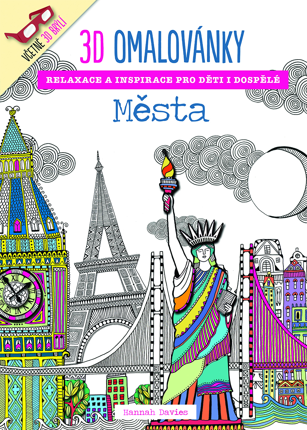 3D omalovánky nabízejí navíc novou dimenzi vybarvování. Naučíte se jednoduše vytvářet propracované 3D kresby a s pomocí speciálních 3D brýlí budete sledovat, jak vystupují z knihy. Ručně kreslené vzory umělkyně Hannah Davies vás díky své propracovanosti a rozmanitosti nepřestanou bavit. V knize se můžete těšit na světoznámá města, jako je Las Vegas nebo Rio de Janeiro, slavné stavby, jako např. baziliku sv. Petra v Římě nebo most Golden Gate v San Franciscu, a monumentální panoramata, jaké vytváří mnohamilionové Tokio a hora Fudži. Kniha navíc obsahuje předtištěné stránky, které vám pomohou plně rozvinout vlastní kresbu.