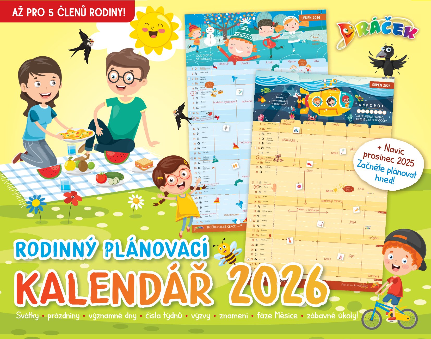 Nástěnný plánovač aktivit až pro 5 členů domácnosti od časopisu Dráček. Všechny měsíce na tvrdém papíru, formát 440 x 285mm, široké sloupce na poznámky. Navíc i prosinec 2025, takže můžete začít plánovat ihned! Svátky, prázdniny, významné dny, čísla týdnů, rodinné výzvy, znamení, fáze Měsíce a navíc i zábavné úkoly pro děti. Nejoblíbenější kalendář dětského časopisu Dráček!