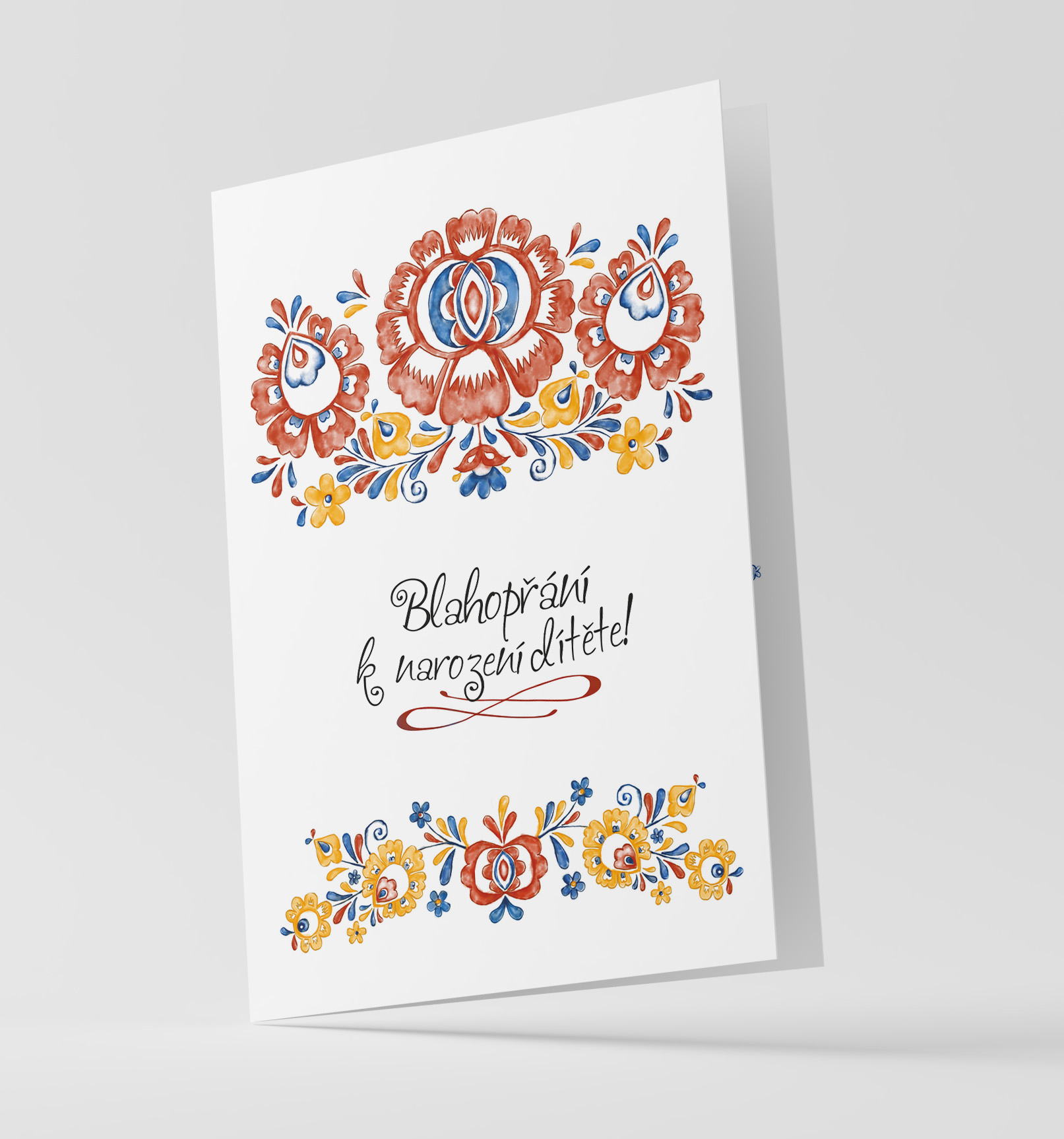 Blahopřání k narození dítěte s tradičním ornamentem s bílou obálkou.
