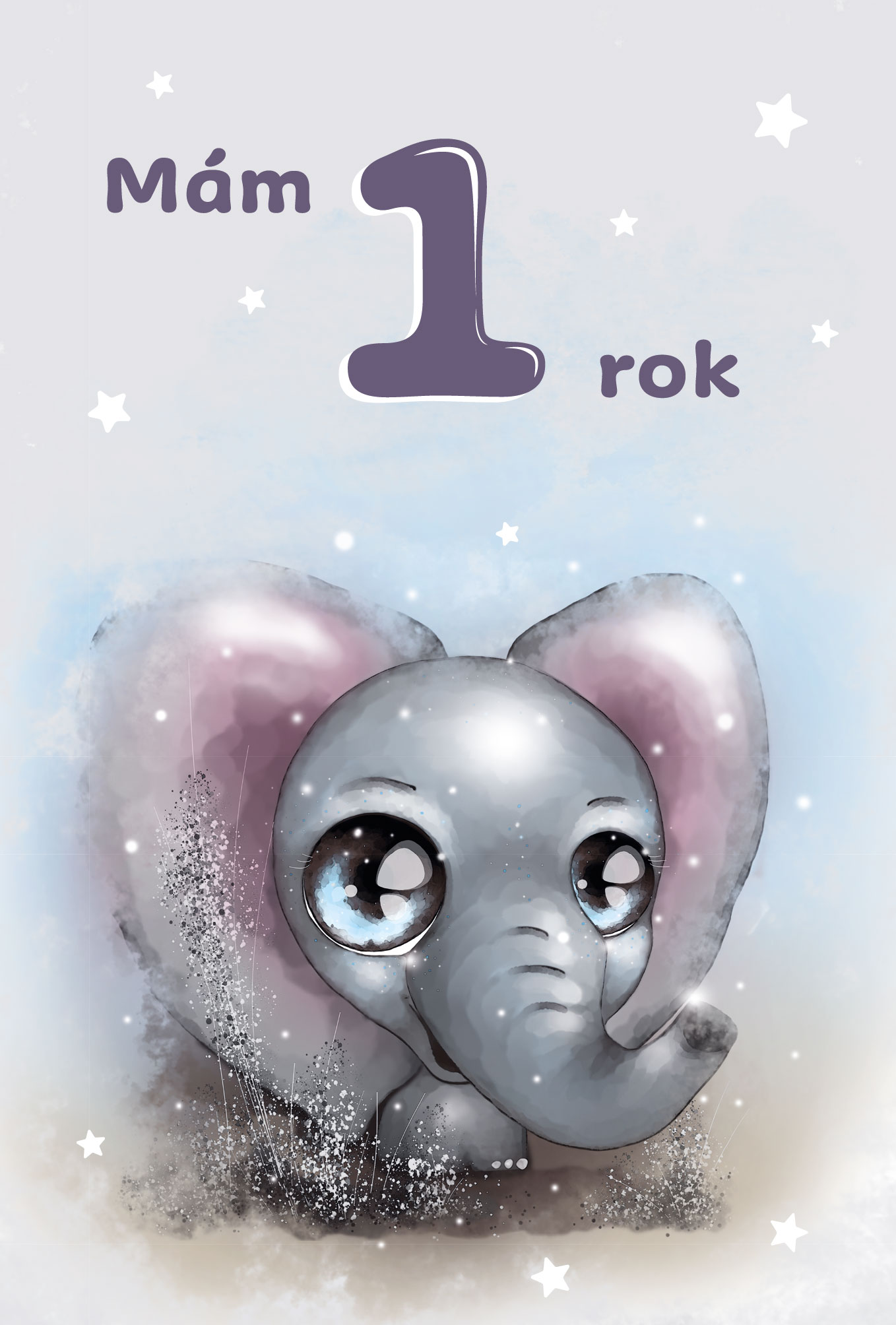 Originální blahopřání k 1. roku se sloníkem potěší všechny malé oslavence. Text na titulní straně: Mám 1 rok. Vnitřní strana ozdobena hvězdičkami s textem: Dnes slavíš svůj první velký rok, ať je každý tvůj krůček radostný krok. A úsměvem objevuj svůj svět, ať je plný lásky a krásných vět.