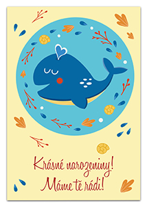Blahopřání dětské k narozeninám s velrybkou. Přání je vevnitř zdobeno motivy z titulní strany. Nemá předepsaný text. Baleno v bílé obálce. Rozměr 19,5x13,5cm.