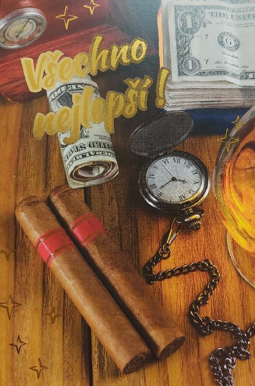 Blahopřání k narozeninám s textem na titulce Všechno nejlepší! Zdobeno zlatým potiskem. Přání je vevnitř zdobeno motivem z titulní strany a textem: Když ti řeknu, že jsi v nejlepších letech,myslím tím, že je nejvyšší čas si užít! Přeji ti báječný den! Baleno v sáčku, součástí je bílá obálka. Rozměr 17x11,5cm.