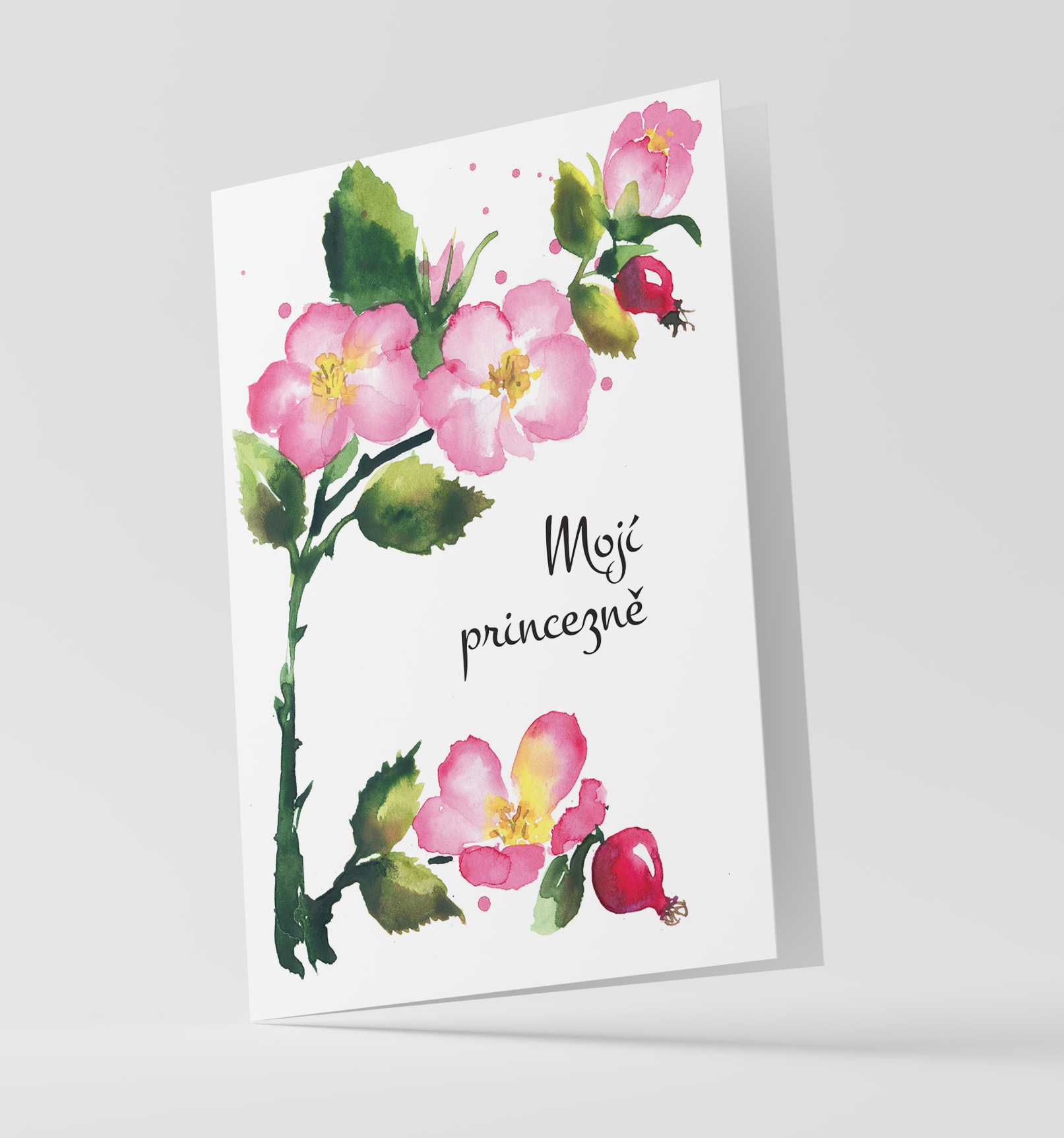 Romantické přání Mojí princezně s malovanými květy šípkové růže s bílou obálkou.