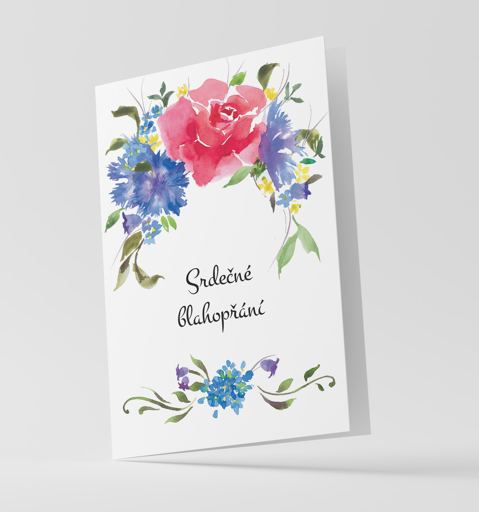 Blahopřání novomanželům, k narozeninám a svátku Srdečné blahopřání s malovanými lučnímy květy s bílou obálkou.