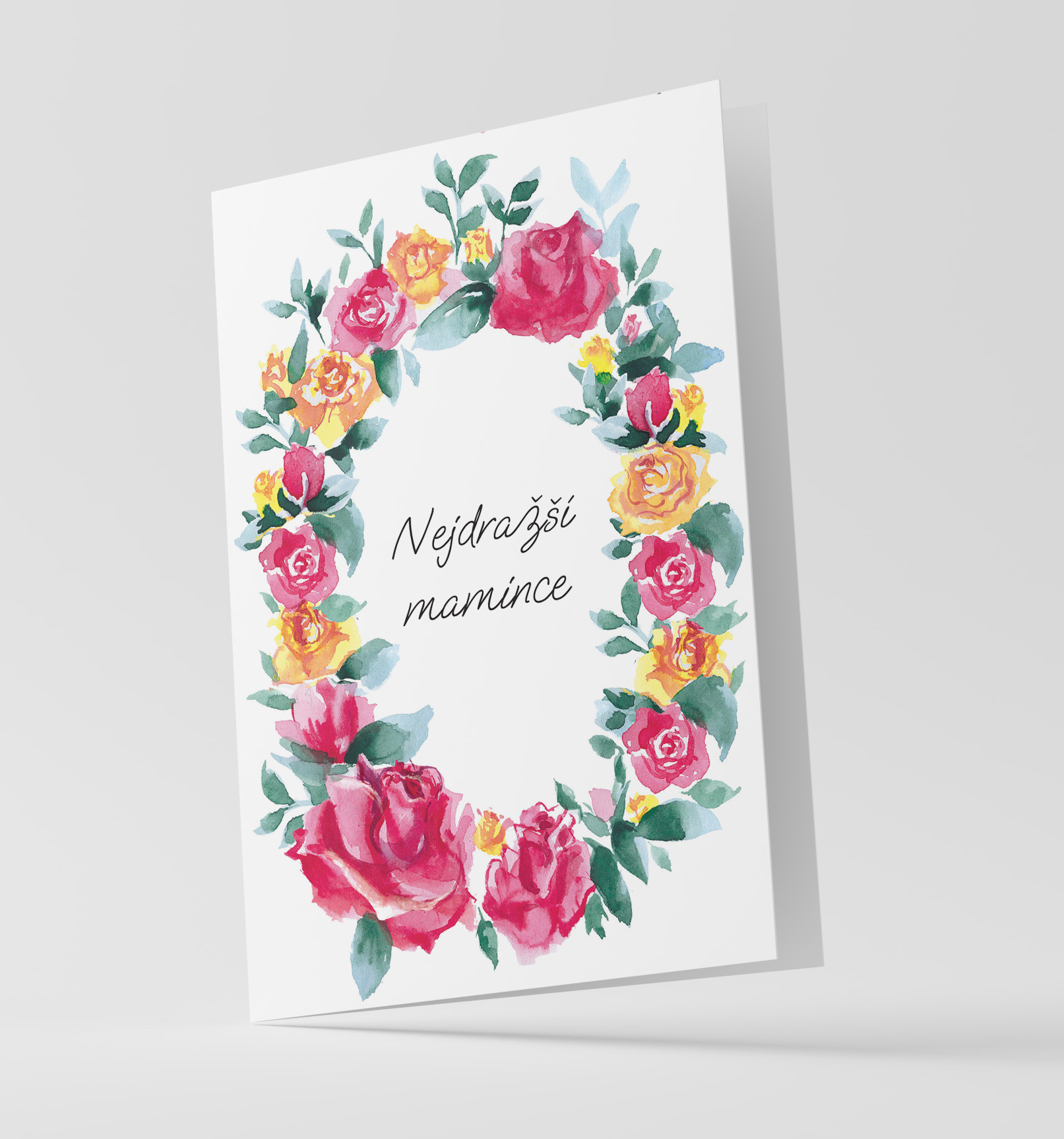 Blahopřání k svátku matek, narozeninám, nebo jmeninám Nejdražší mamince s malovanými květy růží a bílou obálkou.