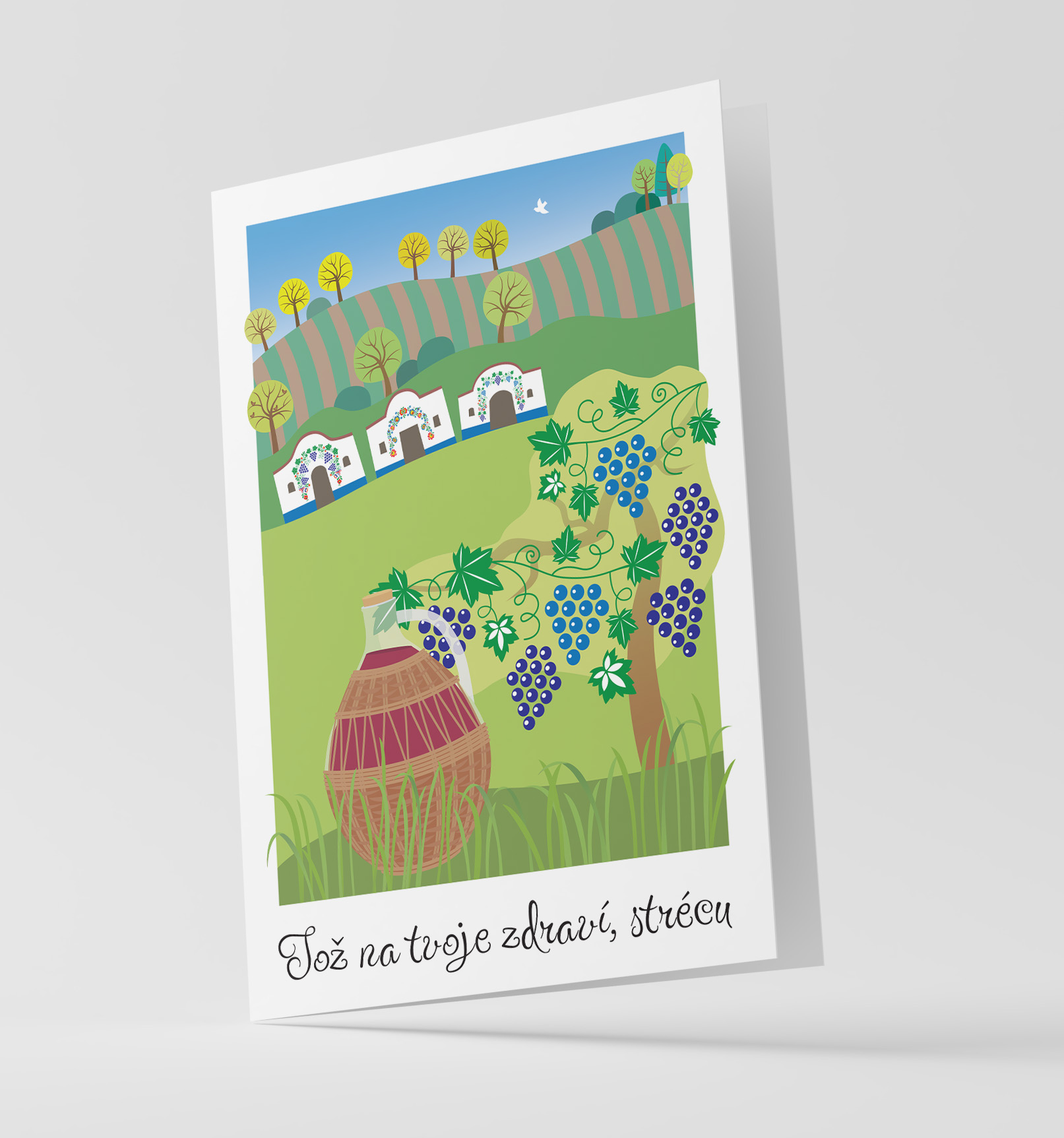 Malované přání Tož na tvoje zdraví, strécu s vinnými sklepy, zdobené tradičnímy ornamenty a bílou obálkou.