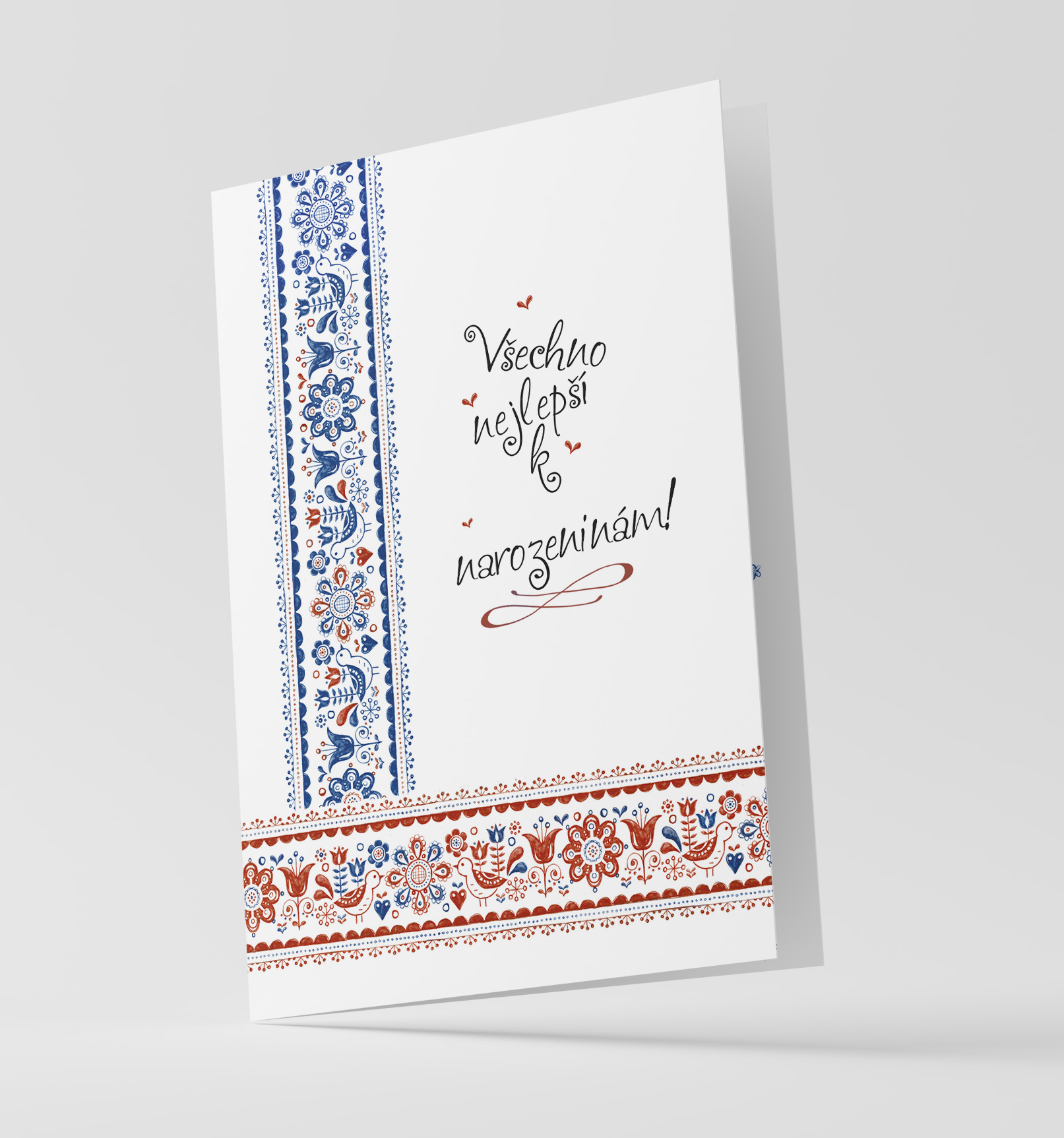 Blahopřání k narozeninám s tradičním ornamentem s bílou obálkou.