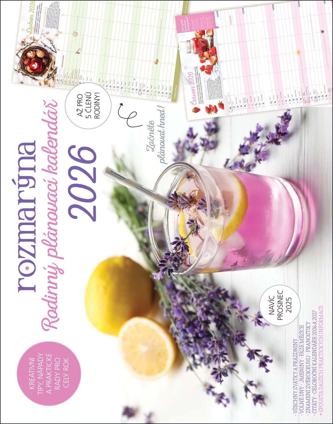 Nástěnný plánovač aktivit až pro 5 členů domácnosti od časopisu Rozmarýna. Všechny měsíce na tvrdém papíru, formát 440×285 mm. Navíc i prosinec 2025, takže můžete začít plánovat ihned! Svátky, prázdniny, volné dny, jmeniny, znamení zvěrokruhu, fáze Měsíce, pranostiky, citáty, celoroční kalendáře na rok 2026 a 2027 + spousta dalších praktických informací. Novinka od kreativního časopisu Rozmarýna!